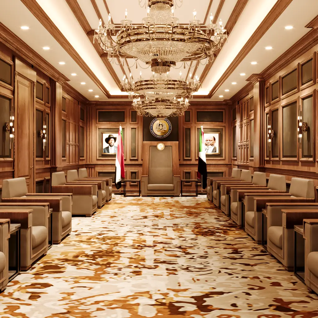 Amitis Design has experience delivering presidential-level executive offices with a classical direction: dark wood wall paneling, bespoke joinery, and luxury leather seating suited for private meetings and leadership work. The interior design below shows how we plan a formal layout, meeting zone, and statement backdrop to create a serious, high-status office interior in Dubai and the UAE.